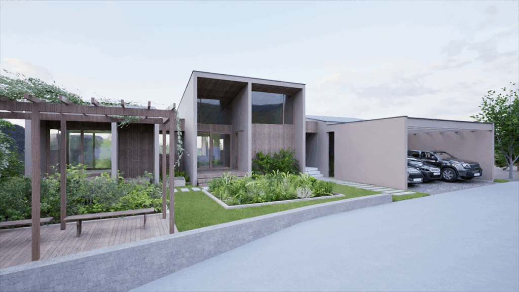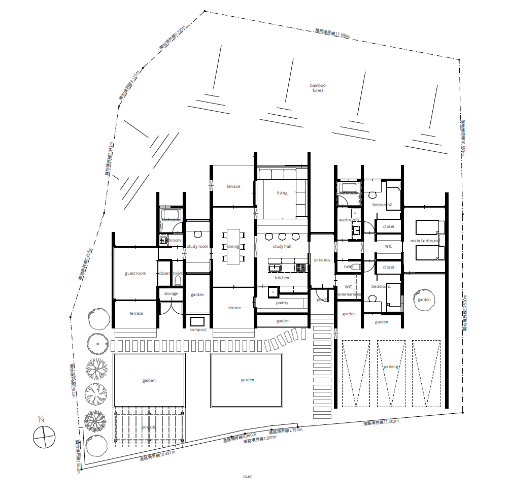 この土地の自然豊かな環境を生かし、敷地北側はプライベート感漂う竹林の景色を楽しみ、南側は畑を設けてガーデニングを楽しめたり、地域の人と交流ができるちょっとしたパーゴラもあります。