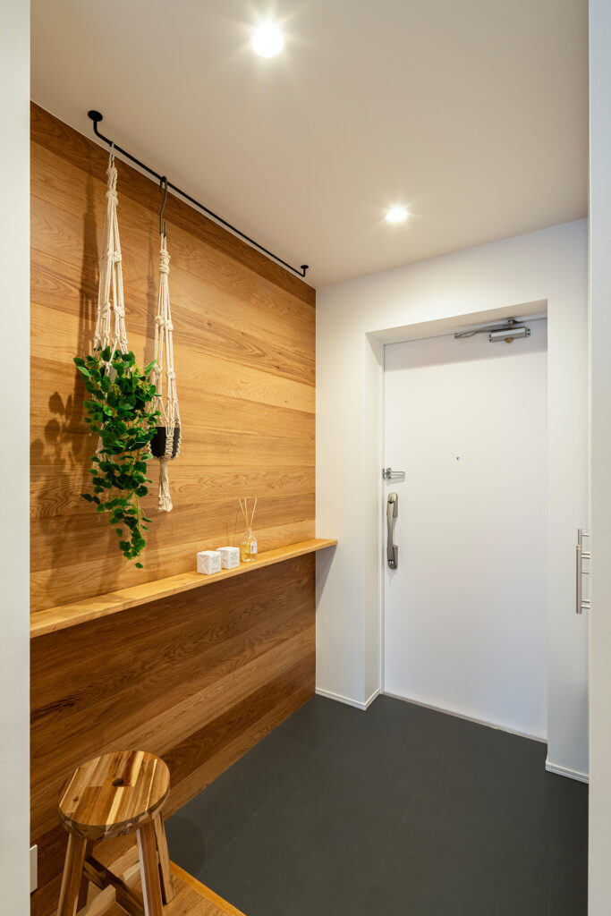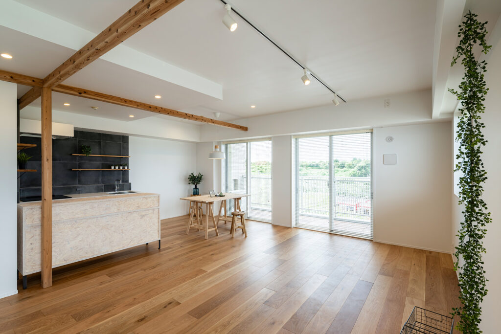 リノベーションでは、木を基調としたやわらかな色調のインテリアにフルリノベーション。木製のフローリングやおしゃれなキッチンタイルを採用し、落ち着きのあるナチュラルな雰囲気に仕上がっています。