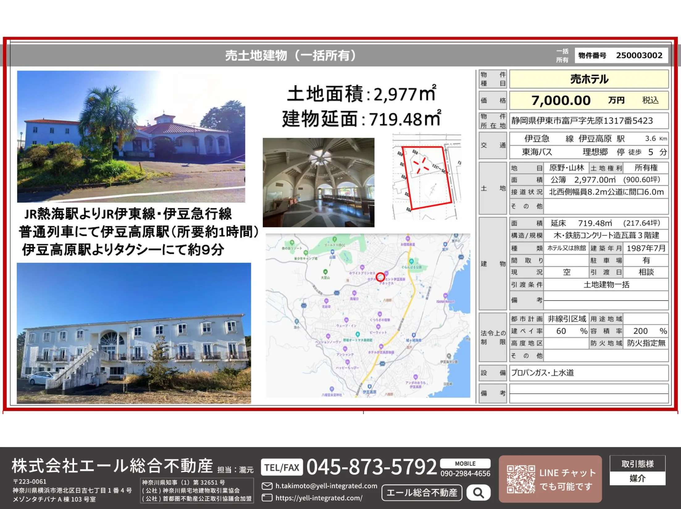 公簿2,977㎡(約900坪)の広大な土地に、延床719.48㎡の3階建てホテル建物がそのまま残る希少物件。
